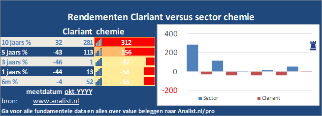 Sinds januari dit jaar verloor het aandeel Clariant 19 procent. De afgelopen 5 jaren waren goede jaren voor beleggers. Tussen 2010 en 2020 won de internationale chemiesector rond de 115 procent (gelijk gewogen). Sinds 2015 staat de internationale sector 60 procent hoger en staat over de afgelopen 12 maanden 12 procent in de plus. Op de beurs was medio 2020 het chemiebedrijf op de beurs rond de 2,5 miljard CHF waard. Daarmee is het aandeel een midcap.