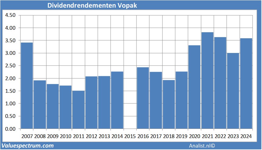 Beleggers in het aandeel Vopak hebben zicht op een aanzienlijke dividenduitkering. Kijkende naar de de verwachtingen van de analisten wordt het aandeel Vopak nu één van de hoogste dividendrendementen van de Nederlandse beurs verhandeld. Over dit jaar ligt de verwachting van de dividenduitbetaling op 1.6 euro. Vopak 's dividendrendement komt neer op 3.58 procent. Het gemiddelde dividend van de offshore diensten-/distributiebedrijven ligt op een relatief summiere 1.49 procent.