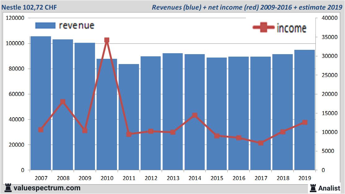 De meeste analisten rekenen voor 2019 op een nettowinst van 12,6 miljard CHF. Over dit jaar komt het bedrijf volgens het gros van de analisten uit op een winst per aandeel van 4,33 CHF. De koers/winstverhouding komt hiermee op 23,72 te liggen.