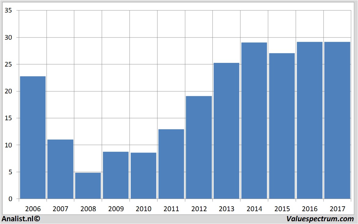 De analisten gaan voor 2017 uit van een nettowinst van 244 miljoen euro. Over dit jaar houdt het bedrijf volgens de analisten een winst per aandeel van 1,88 euro over. Hiermee komt de koers/winst-verhouding op 15,51 te liggen.