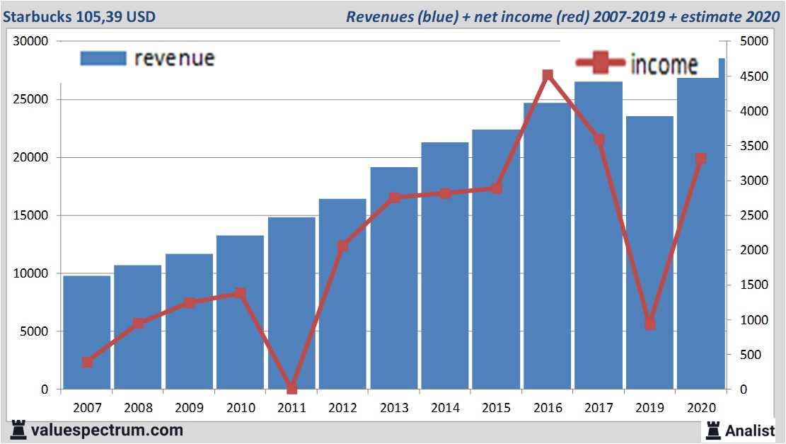 De meeste analisten rekenen voor 2020 op een nettowinst van 3,32 miljard dollar. Over dit jaar ligt de consensus van Starbucks 's resultaat per aandeel op een winst van 2,82 dollar. Op basis hiervan komt de koerswinstverhouding op 37,37 te liggen.