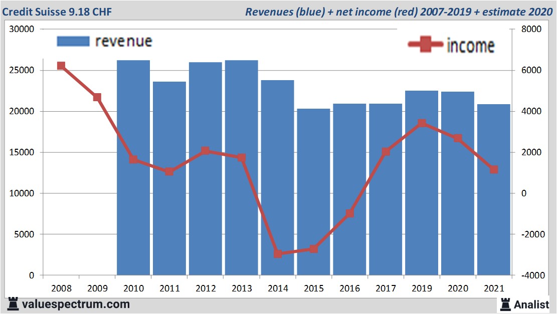 De meeste analisten gaan voor 2021 uit van een nettowinst van 1.3 miljard CHF. Over dit jaar ligt de consensus van Credit Suisse 's resultaat per aandeel op een winst van 56 cent. Op basis hiervan komt de koerswinstverhouding op 16.84 te liggen.