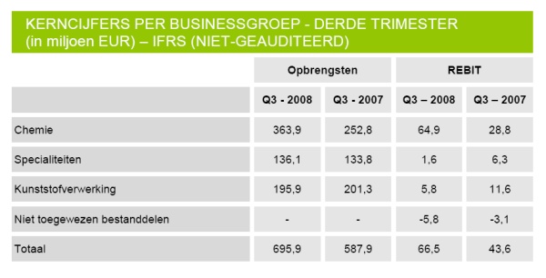 De opbrengsten van Q3 zijn gestegen van 587.9 euro naar een bedrag van 695.9 miljoen euro. De businessgroep Chemie heeft met een stijging van 111.1 miljoen euro in de opbrengsten een grote opbrengstengroei doorgemaakt. Hieronder een schema waarin de businessgroepen verdeeld worden qua opbrengsten en rebit.